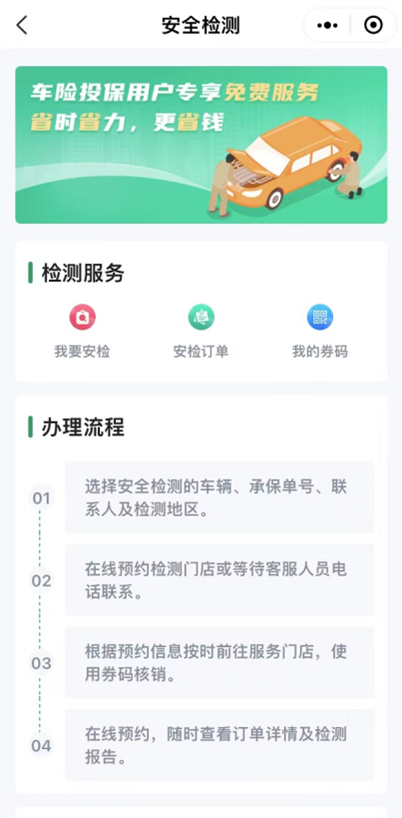 根据中保协发布定义,安全检测是指保单在有效期内,为保障车辆安全运行,保险人或其受托人根据被保险人请求,为被保险机动车提供车辆安全检测服务。
